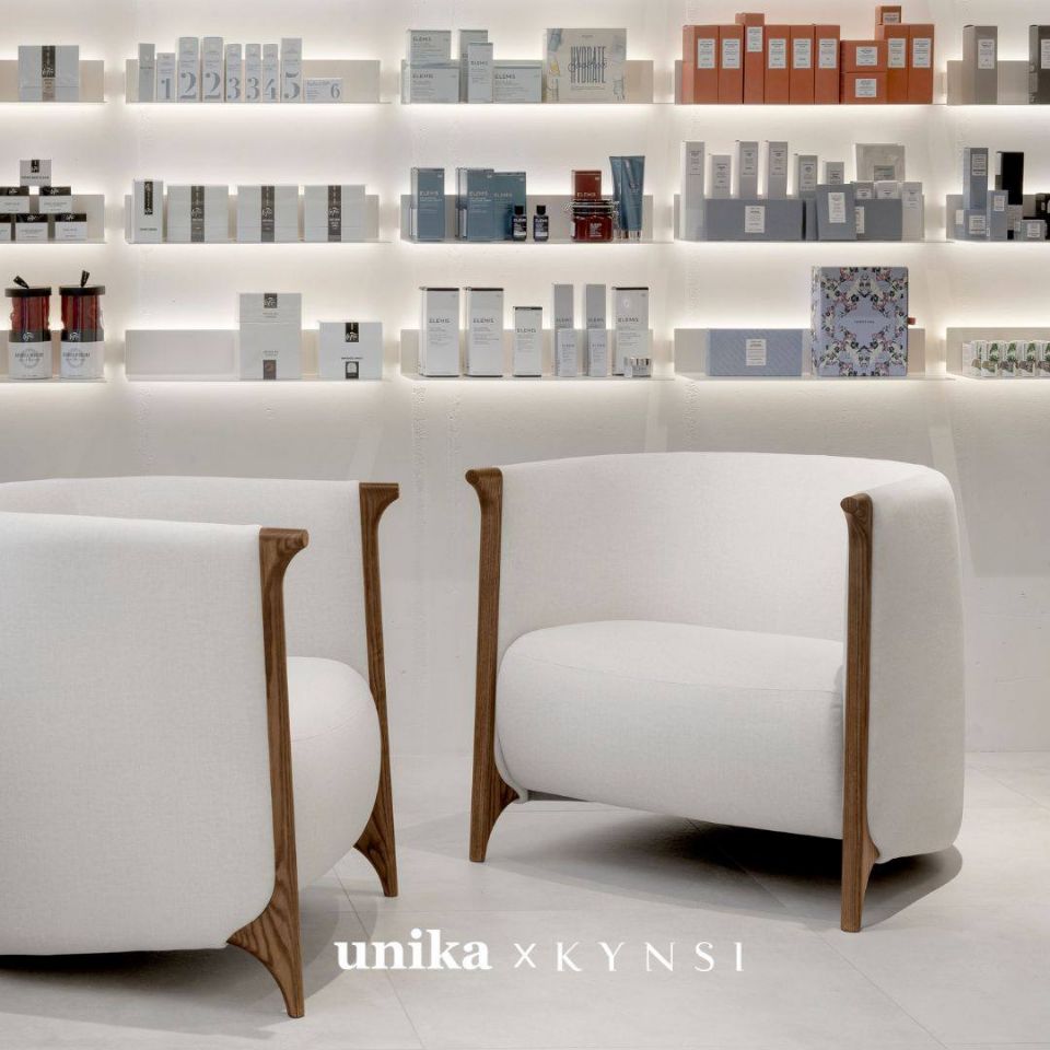 Интерьер нового салона гармонично дополнили предметы UNIKA. Кресла Kyns, вдохновленные изяществом и грацией семейства кошачьих, удачно обыгрывают плавную форму зоны ресепшн, приглашая насладиться красотой и гармонией пространства. Овальный стол Casper с тканевым основанием выполняет роль центрального предмета и зонирует пространство 2-го этажа, разбавляя его геометрию и вступая в диалог с вертикальными ламелями, задающими ритм в приватной зоне педикюрных залов. Элегантная сдержанность, природная естественность, тихая красота и чистые линии предметов UNIKA выгодно подчеркивают аутентичность интерьера салона KYNSI.